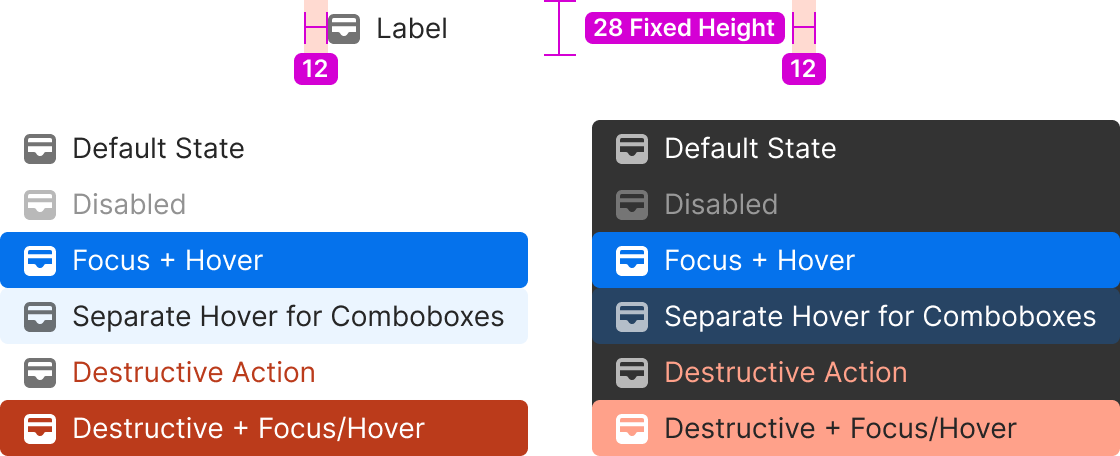 Because comboboxes are primarily keyboard driven (text fields combined with menus below that filter or autocomplete), we have found that having the focus and hover state be the same can lead to accidental selection of the wrong item when a hand brushes against a trackpad while typing. So in that use case, menus gain a separate hover state leaving the focus state for keyboard use.