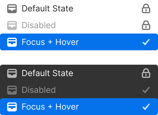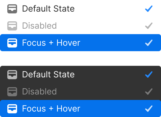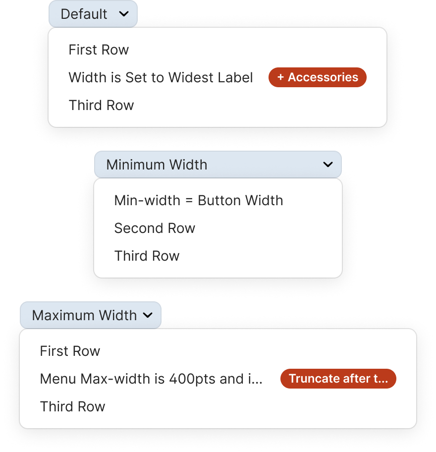 The default width of a menu is set by the row with the widest row including it’s Text + Icon label and any accessories shown. Set the minimum width to the button that the menu is attached to.This rule can be broken in extreme circumstances. Full width buttons in a very wide view for example. The maximum width of the menu container is 400pts or the width of the window it’s in (whichever is smaller). The accessory max width is 120pts. Both the accessory text and the Icon + Text Label’s text should truncate if it goes beyond the space available.