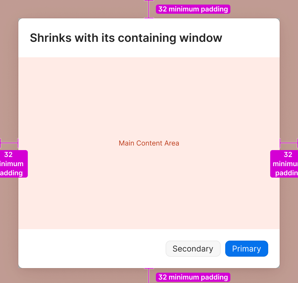 Content within the content area, as well as the buttons, should shrink and truncate appropriately in order to avoid severe degradation of the interface. A modal is vertically and horizontally centered within the window or viewport in which it is placed.