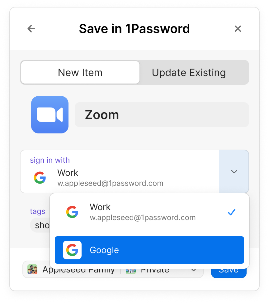 Empower users to seamlessly manage SSO logins within 1Password, eliminating the need to remember which provider they used for each website.