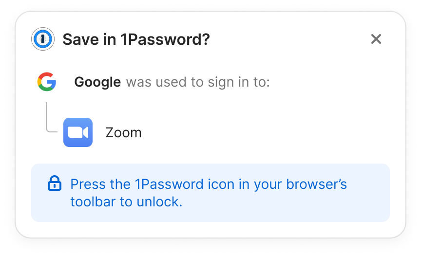 In light of this, we ask ourselves, how can we add value? To address this, when we detect SSO buttons on a page or recognize an SSO login attempt, we promptly display a notification. This notification encourages the user to unlock, enabling us to either securely save the credential or remind them of an existing one already stored in 1Password.