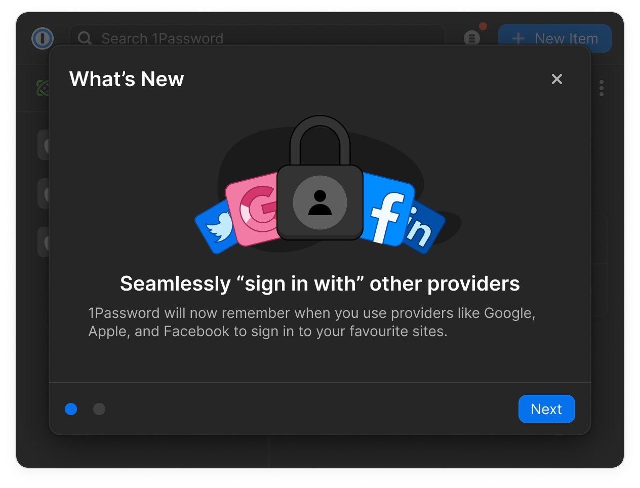 A recurring challenge we encountered in prior feature releases was our capacity to effectively onboard and communicate these changes to our users. In a concerted effort to diminish confusion and facilitate user adoption of the 'Sign in with' feature, we conceived a fresh approach—a "What's New" screen. This strategy proved remarkably successful and has now become the established norm for all forthcoming 1Password releases.